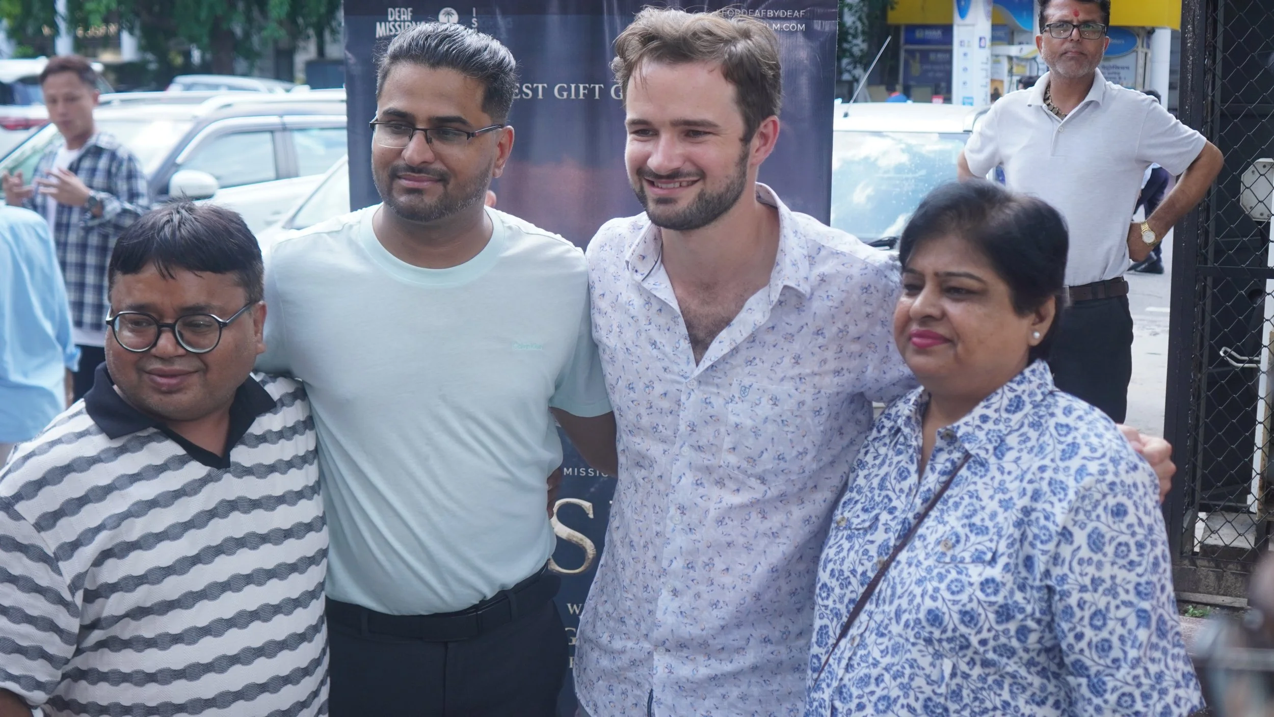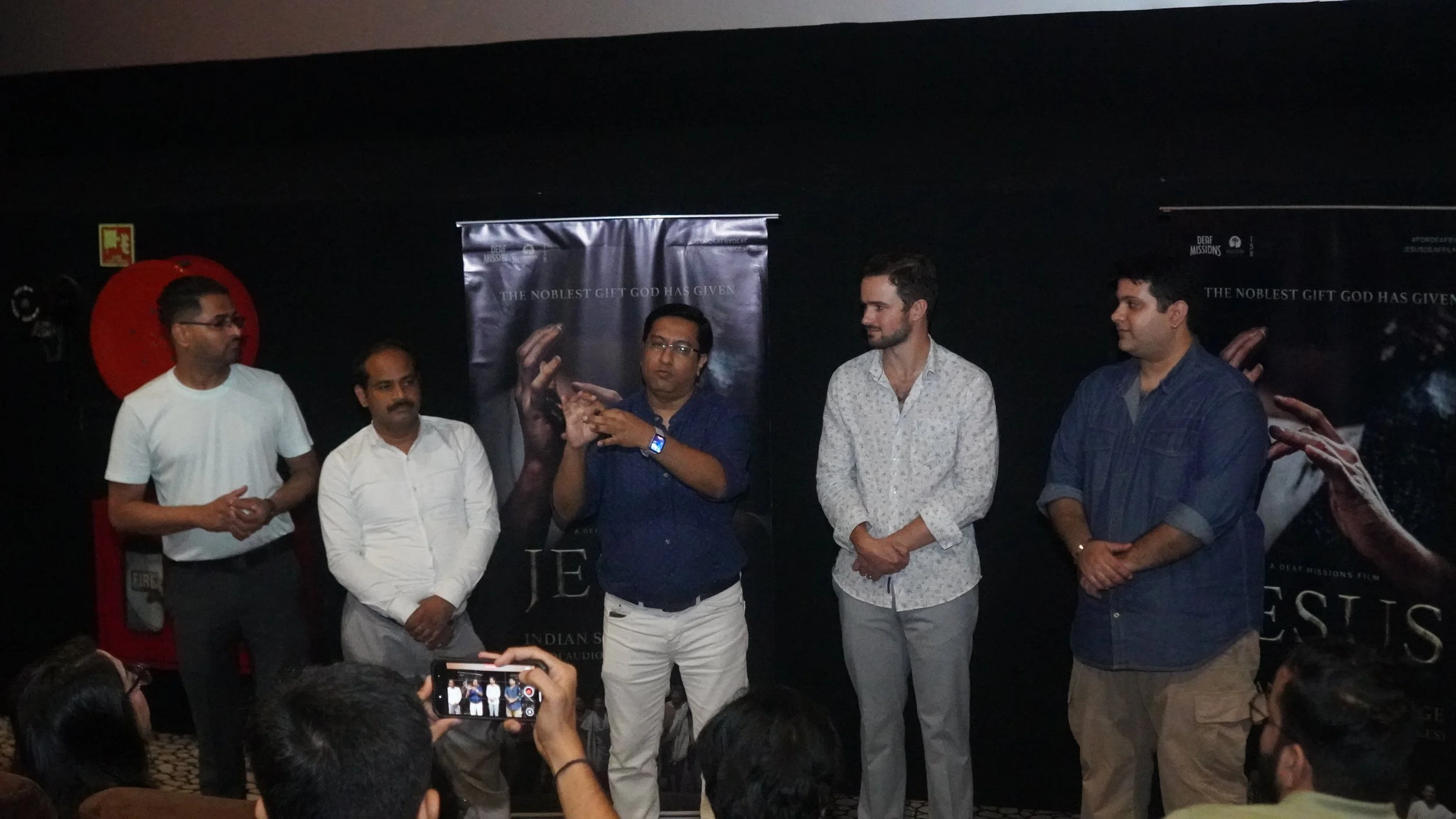 Group of seven people standing together indoors in front of a promotional banner for a film titled 'Jesus' with Indian sign language. All are smiling, dressed in casual or semi-formal clothing.