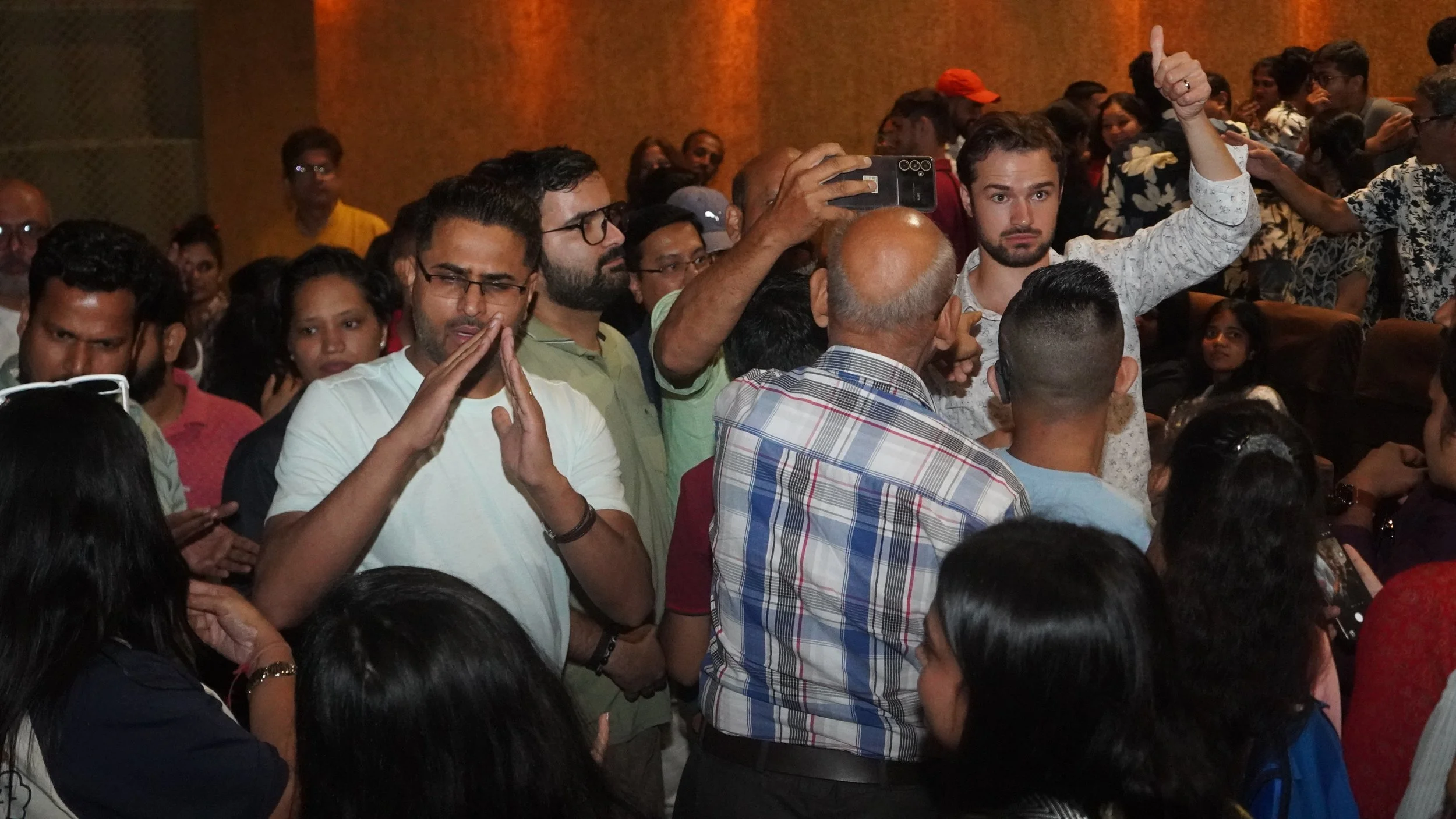 A group of people gathered in an indoor setting, some standing, some using their phones, with one man giving a thumbs-up and another person making a prayer gesture. The background shows a wall with warm lighting, and the crowd appears diverse in age and attire.